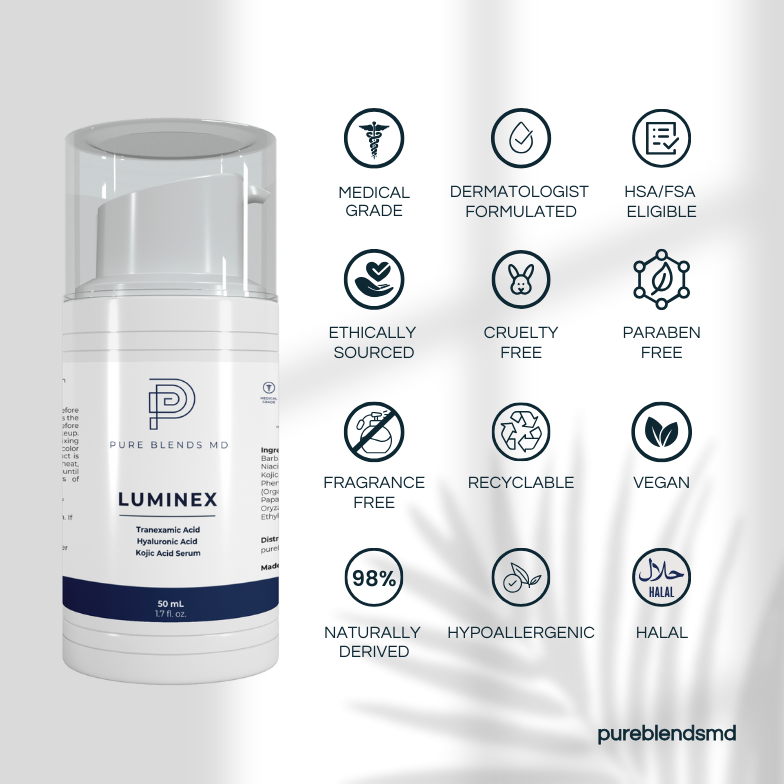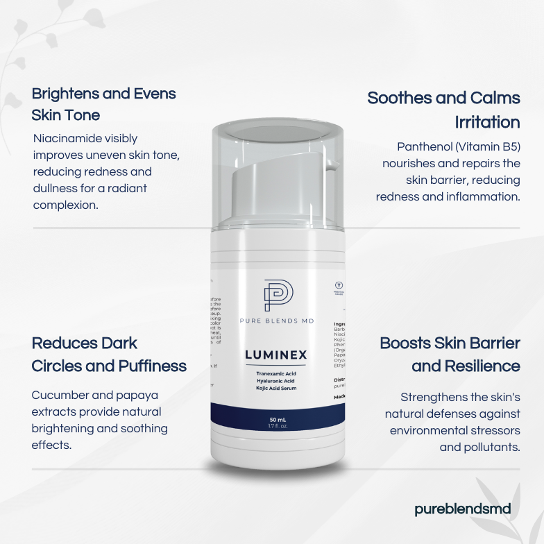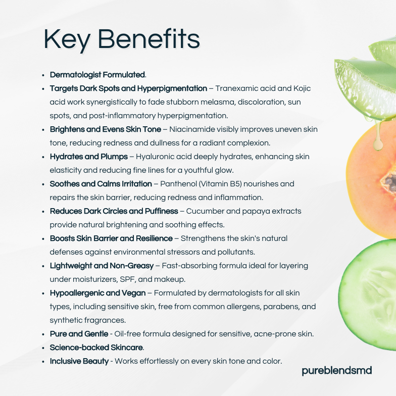• Targets Dark Spots & Hyperpigmentation – Tranexamic acid and Kojic acid work synergistically to fade stubborn melasma, discoloration, sunspots, and post-inflammatory hyperpigmentation.