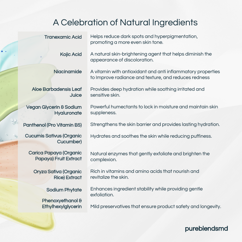 Ingredients: Tranexamic Acid, Kojic Acid, Niacinamide, Aloe Barbadensis Leaf Juice, Vegan Glycerin, Sodium Hyaluronate, Panthenol (Pro Vitamin B5), Cucumis Sativus (Organic Cucumber) Fruit Extract, Carica Papaya (Organic Papaya) Fruit Extract, Oryza Sativa (Organic Rice) Extract, Sodium Phytate, Phenoxyethanol, Ethylhexylglycerin.